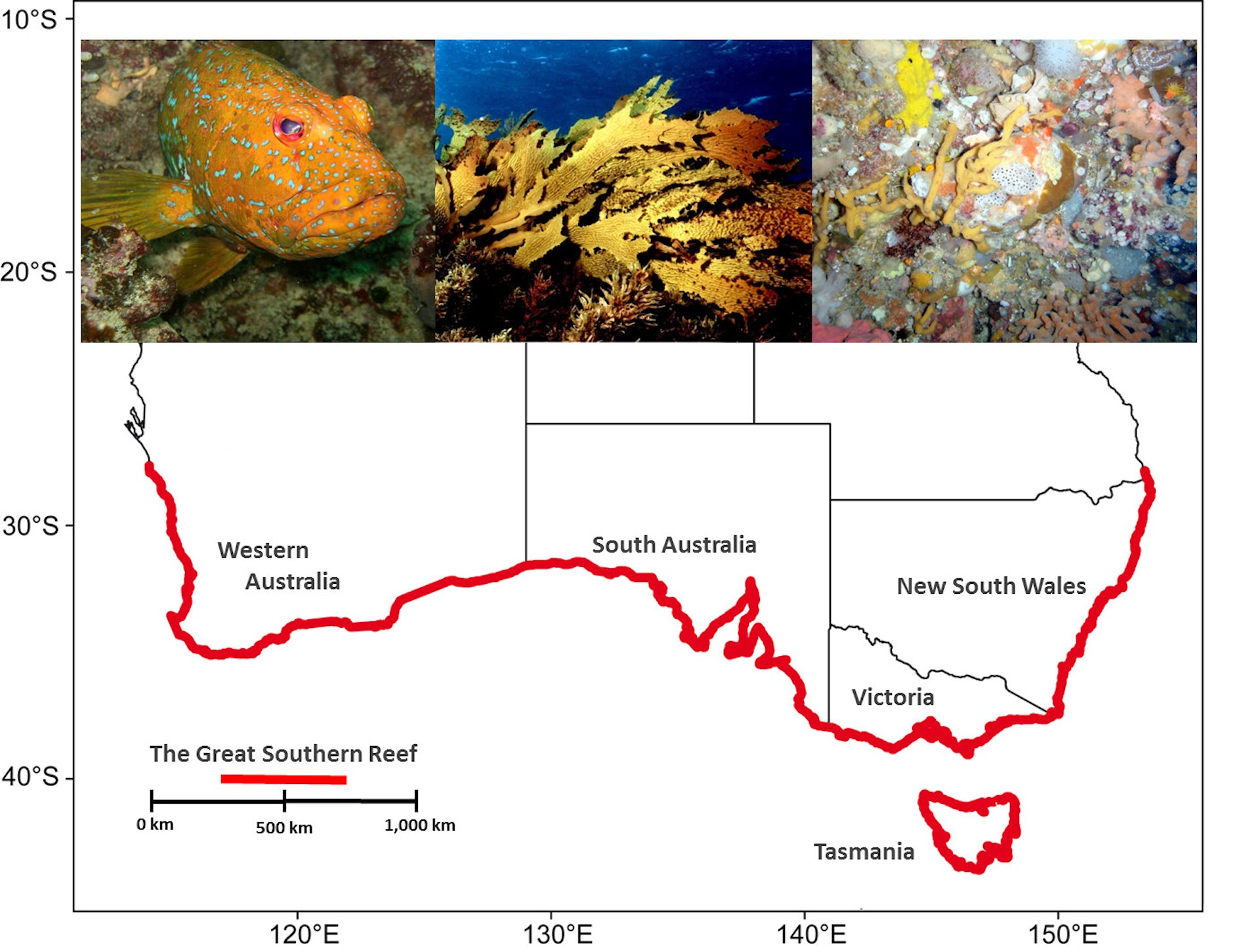 The GSR runs along the southern Australian coast from Kalbarri (North of Geralton) in the west to K’Gari (Frazer Island) in the east. It consists of approximately 220 "seascapes" spread over about 8,000km. Each seascape represents a unique ecosystem of geography (rivers, bays and/or estuaries), history, biology, and demographics. Flora and fauna move between these seascapes as part of an overall ecosystem. A map of the reef is shown on the right thanks to The Coversation.